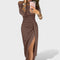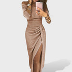 Com uma escolha de cores bonitas, como café, preto, verde, champanhe, cinzento e vermelho, este vestido é simultaneamente chique e intemporal. Combina elegância e glamour - ideal para convidados de casamentos e outras ocasiões festivas.
