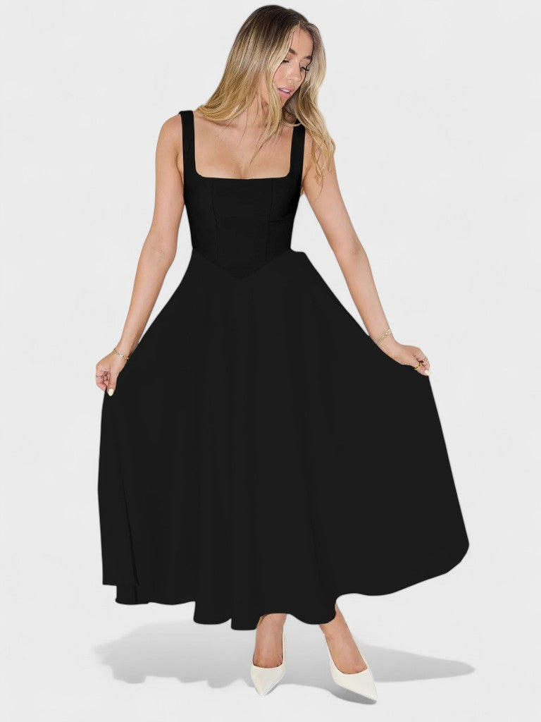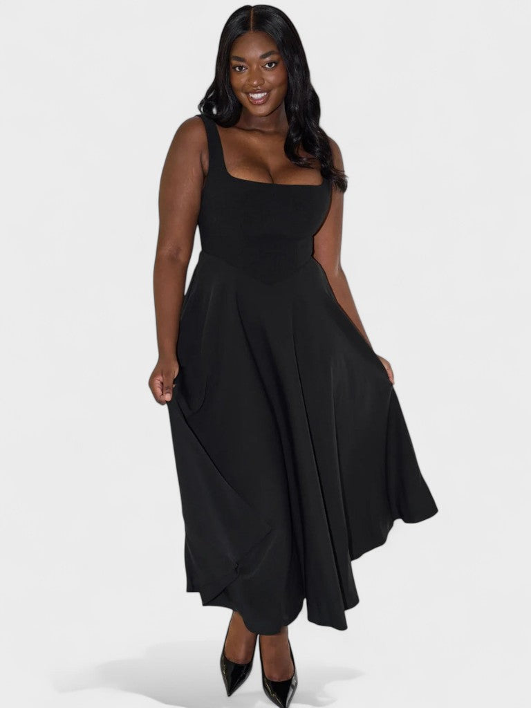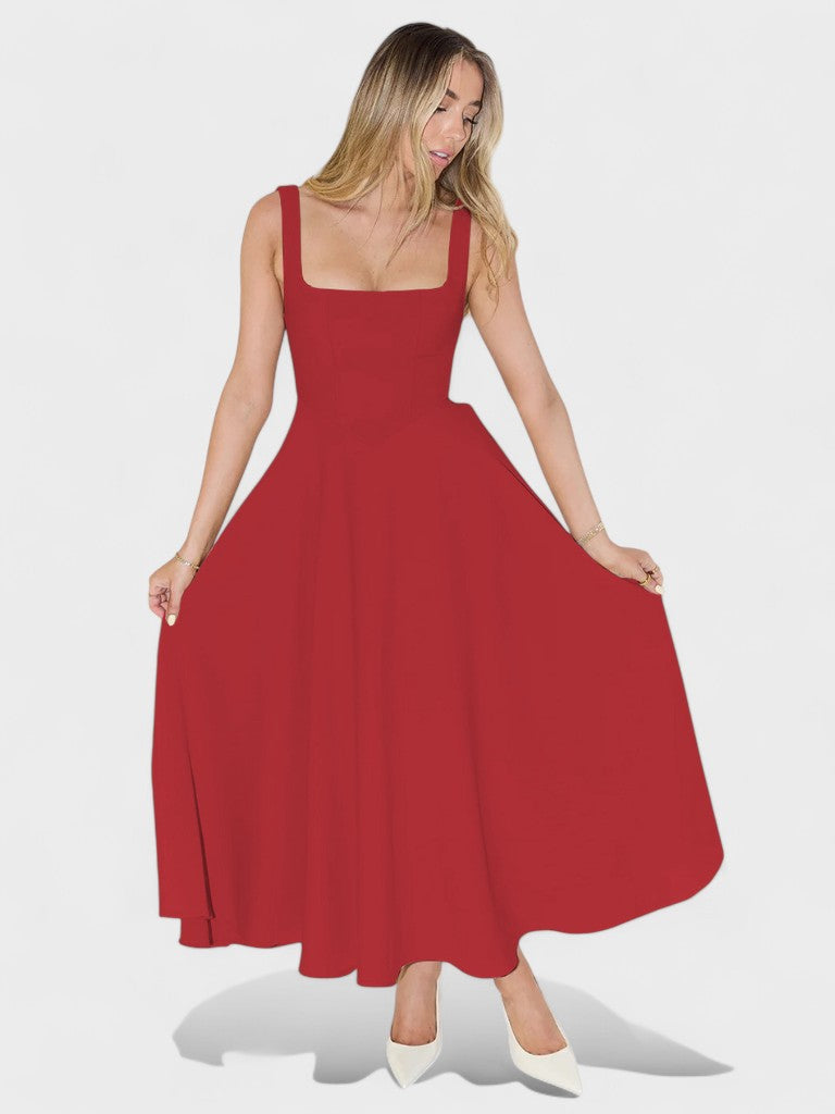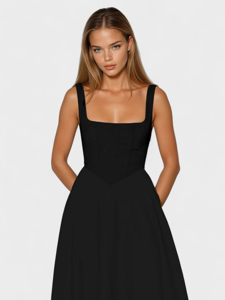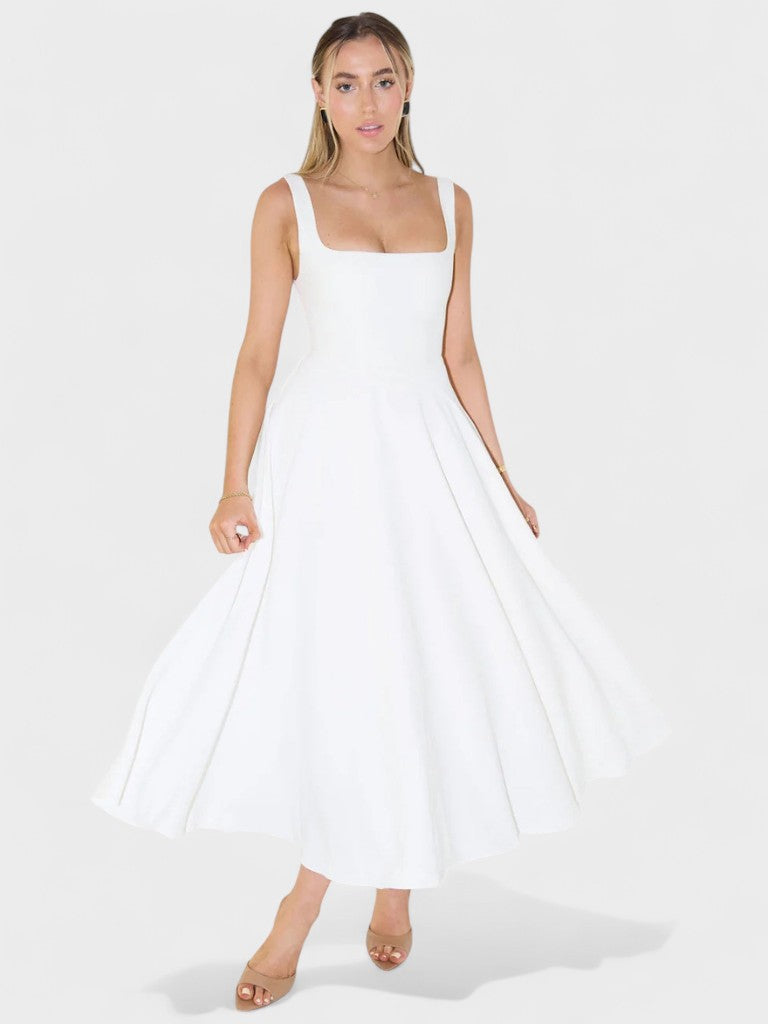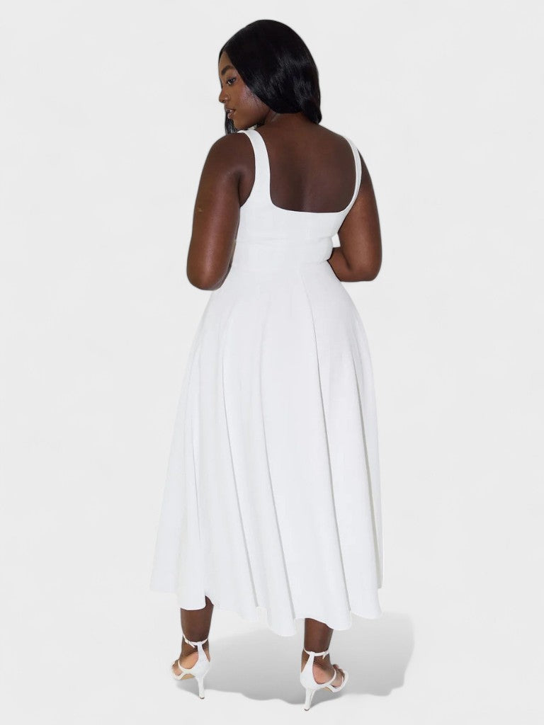 Silhueta valorizada - O corpete ajustado e o decote quadrado estruturado desenham e valorizam a cintura, enquanto a saia ampla equilibra proporções para um look harmonioso.