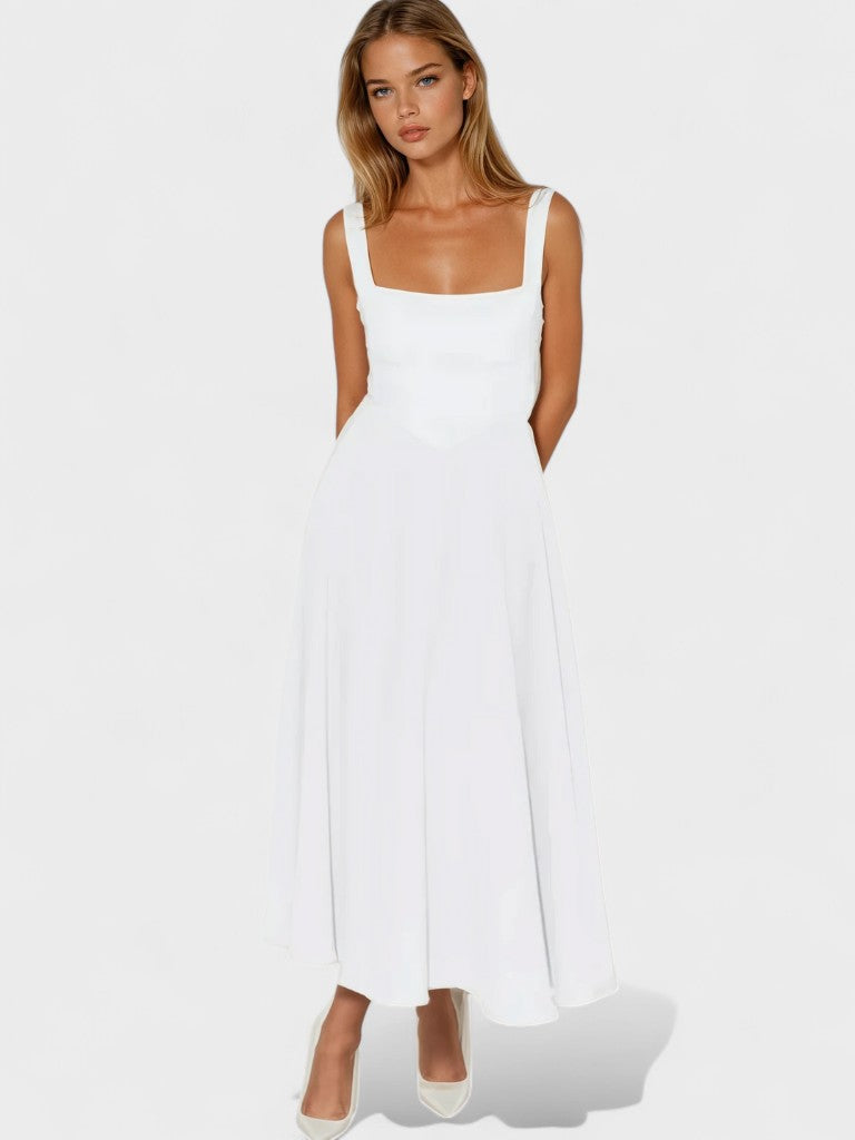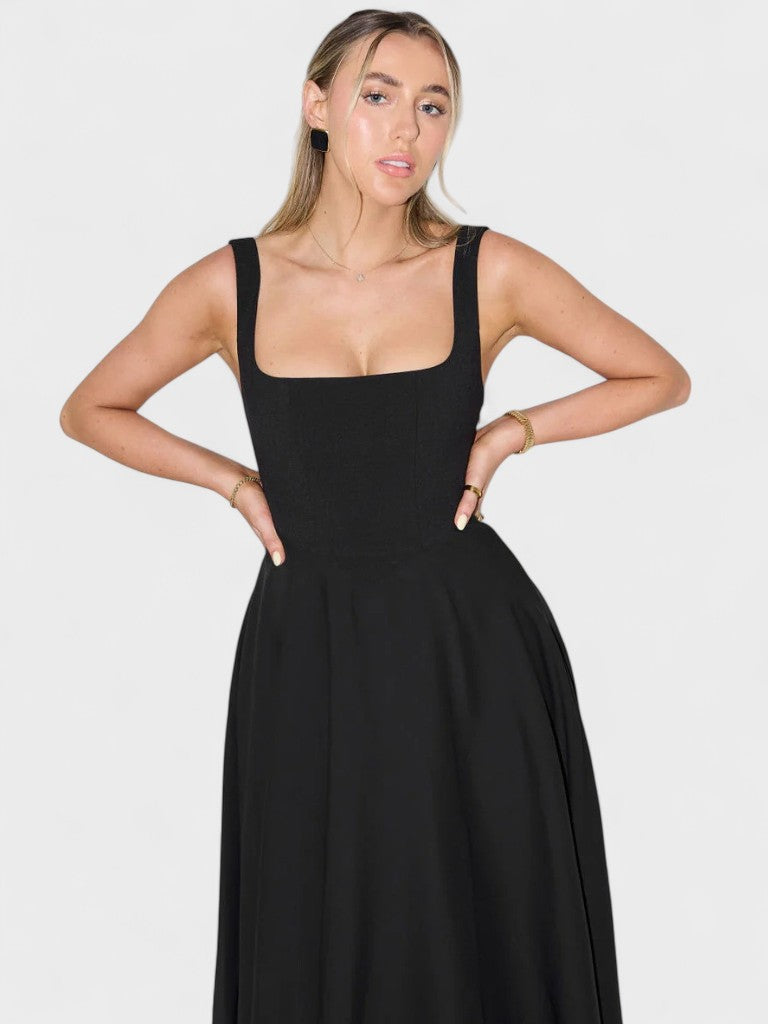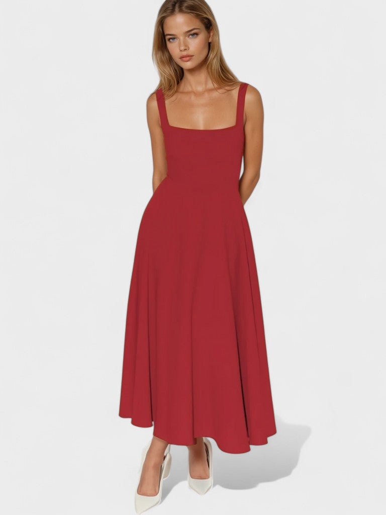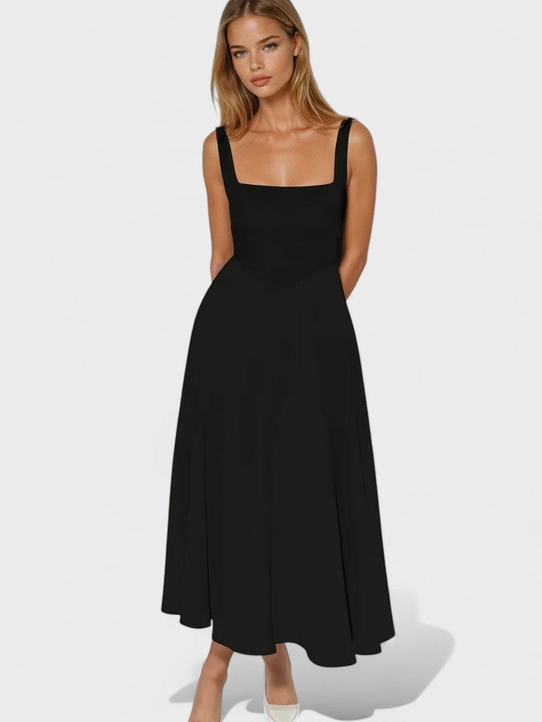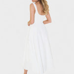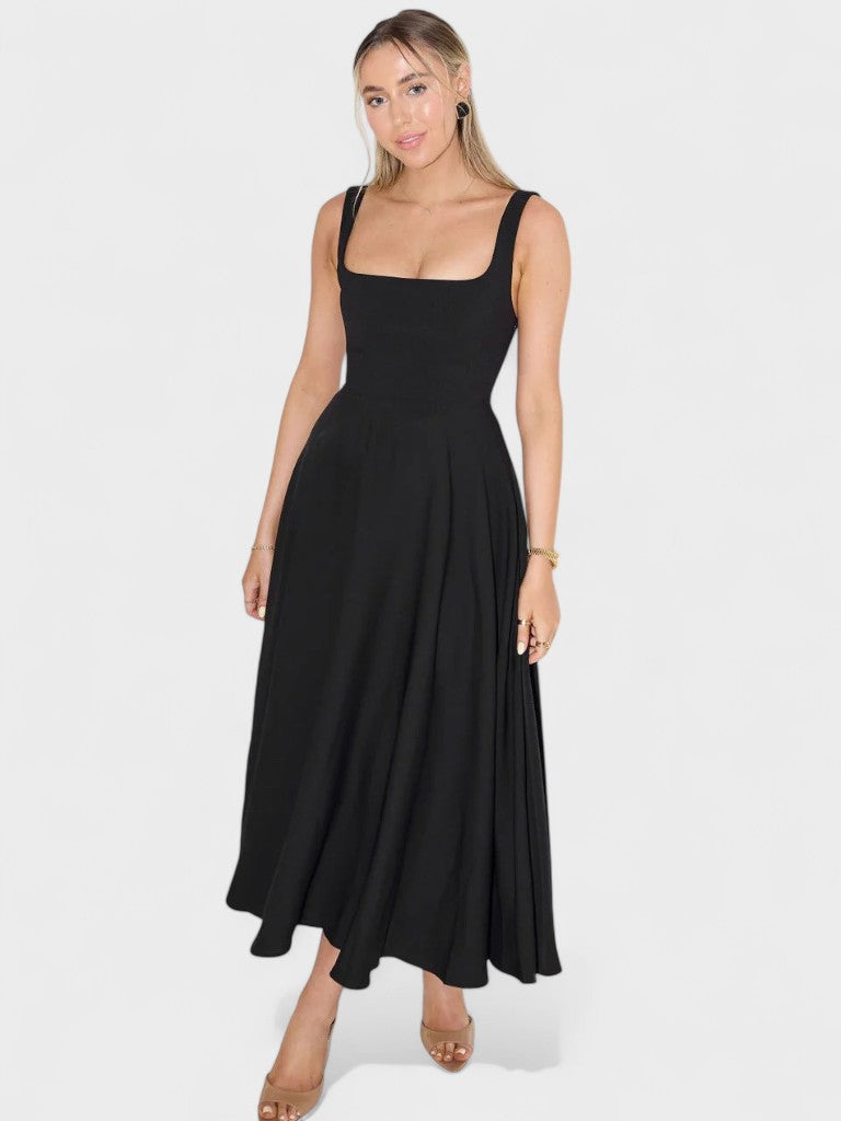 Silhueta valorizada - O corpete ajustado e o decote quadrado estruturado desenham e valorizam a cintura, enquanto a saia ampla equilibra proporções para um look harmonioso.