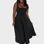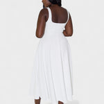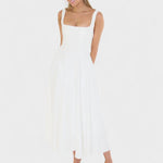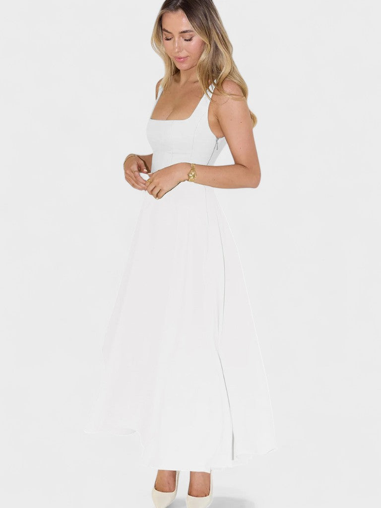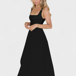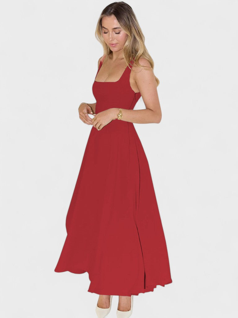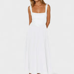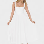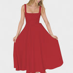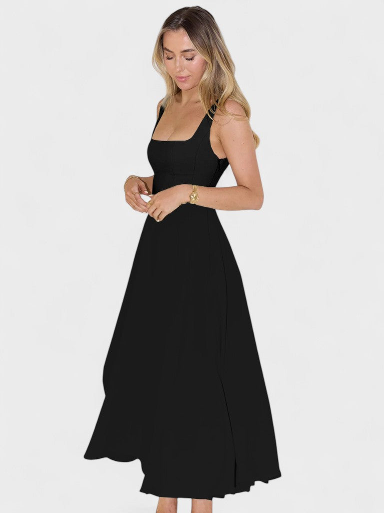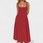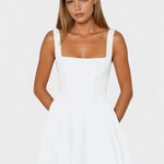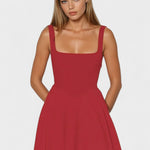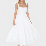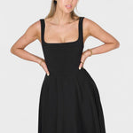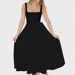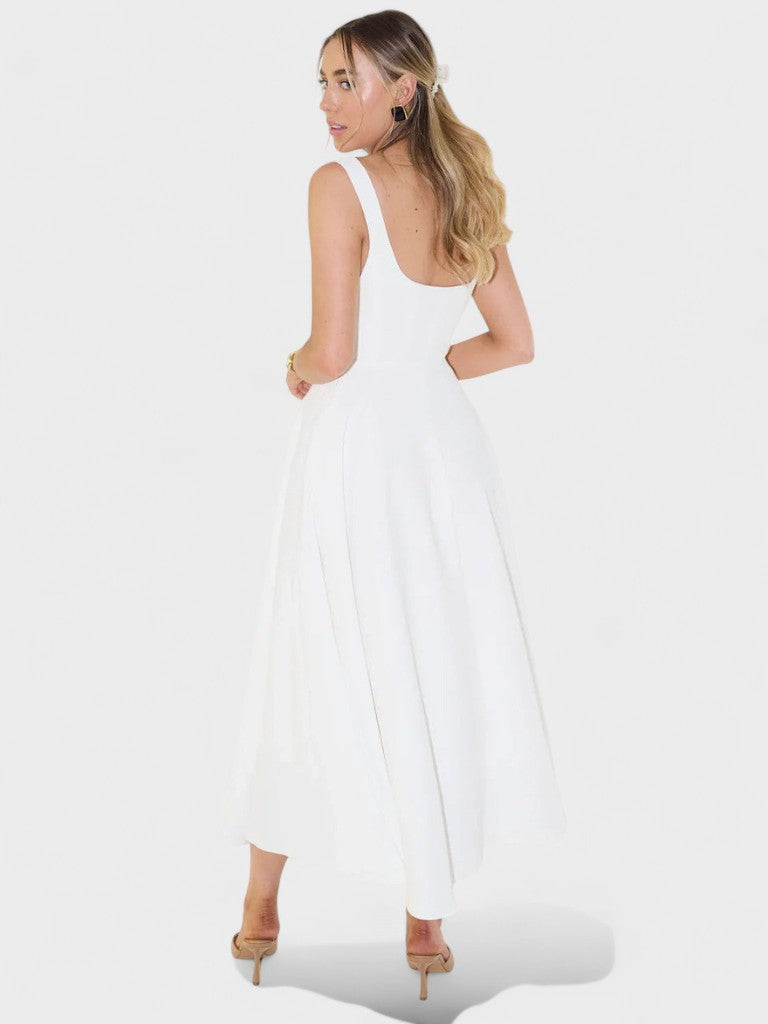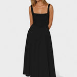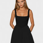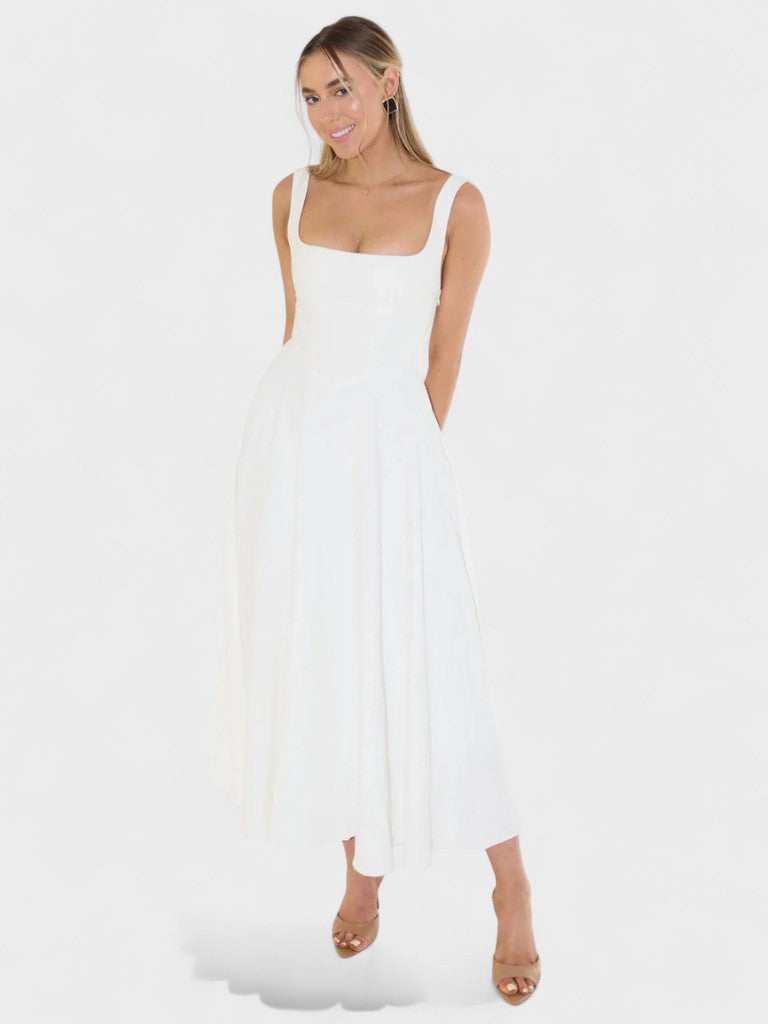 Silhueta valorizada - O corpete ajustado e o decote quadrado estruturado desenham e valorizam a cintura, enquanto a saia ampla equilibra proporções para um look harmonioso.