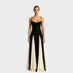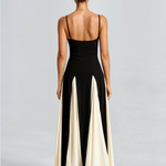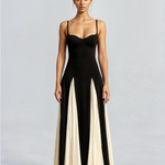 Este elegante vestido maxi apresenta um corpete ajustado com um decote coração que realça lindamente os ombros e o pescoço. A saia fluida exibe um gracioso design de painel bicolor, adicionando profundidade e movimento a cada passo. Perfeito para ocasiões formais, este vestido combina a elegância intemporal com um charme moderno para um look verdadeiramente cativante.