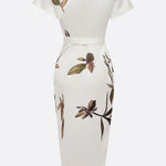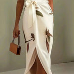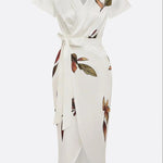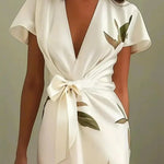 Este elegante vestido envolvente apresenta um decote em V profundo e mangas curtas e esvoaçantes para um look feminino e gracioso. A cintura é acentuada com um cinto de fita amarrado, adicionando definição e uma silhueta lisonjeira. Seu tecido macio e fluido cai lindamente, enquanto a saia em estilo envolvente e o delicado padrão de folhas conferem um toque refinado, perfeito para ocasiões especiais ou para um uso elegante durante o dia.