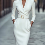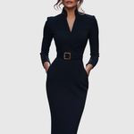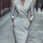 Este vestido apresenta um sofisticado decote simulado em envoltório, mangas três quartos e uma silhueta lápis elegante. Um cinto estruturado com uma fivela quadrada acentua a linha da cintura. O design ajustado segue as curvas naturais, oferecendo linhas limpas e suaves. A estrutura subtil nos ombros e os bolsos laterais adicionam funcionalidade sem sacrificar o estilo. Disponível em tamanhos XS a 2XL para todos os tipos de corpo.