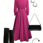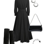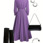 Este vestido apresenta um decote em V lisonjeiro e mangas longas com punhos para um visual equilibrado e refinado. A cintura ajustada é realçada com um cinto correspondente e detalhe de fivela dourada, enquanto a saia plissada até ao chão adiciona um belo movimento e elegância. Uma escolha perfeita para um estilo polido e conforto diário.