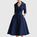 Este vestido apresenta um decote em V feminino com um corpete suavemente envolto e um elegante comprimento midi. A cintura estruturada realça a sua forma, enquanto a saia evasê adiciona movimento e charme. Projetado com mangas 3/4 e discretas bolsos laterais, oferece uma silhueta intemporal que se adapta a ocasiões tanto descontraídas quanto mais formais.