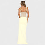 Este vestido encapsula a essência da feminilidade contemporânea com uma silhueta elegante e detalhes que fazem a diferença. O corpete estruturado com alças finas contrasta harmoniosamente com a zona central em renda translúcida, oferecendo um jogo subtil de revelação e sofisticação.