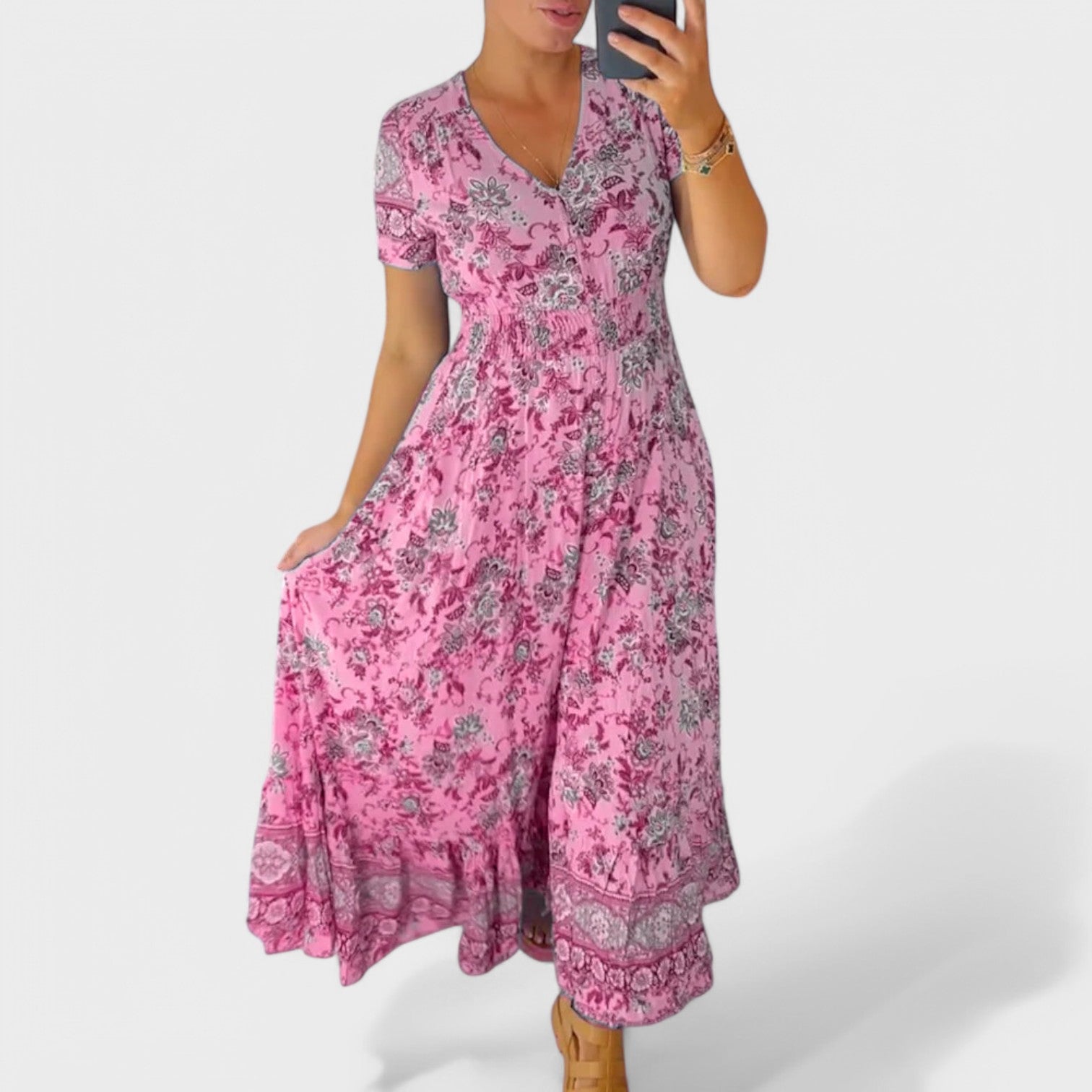 Este vestido é a combinação perfeita de charme e conforto. Com um caimento leve e um design floral delicado, ele é ideal para quem busca um look que transita com facilidade entre o casual e o sofisticado. Com botões frontais e um corte que valoriza a silhueta, é a escolha ideal para momentos especiais ou para o dia a dia com um toque de estilo.