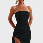 Elegância Atemporal - O corte comprido e o design sem alças dão-lhe um ar sofisticado e clássico, perfeito para eventos formais, jantares ou festas.