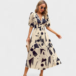 Com um padrão arrojado e moderno, este vestido é a fusão perfeita entre estilo e expressão artística. O corte midi com decote em V e mangas abalonadas realça a silhueta com elegância e atitude, tornando-o ideal para mulheres que gostam de marcar presença com sofisticação e originalidade.