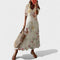 Este vestido longo fluido é a escolha perfeita para quem procura conforto com um toque de elegância natural. Com mangas curtas franzidas, decote em V e pormenores com cordão e pompons, é ideal para dias de sol, passeios descontraídos ou um almoço ao ar livre. O padrão floral inspirado na natureza dá-lhe um charme boho e descontraído, perfeito para a temporada primavera-verão