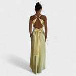 Este vestido foi concebido para destacar a elegância natural de quem o veste. Com um decote em V cruzado que valoriza subtilmente o busto e uma cintura ajustada que define a silhueta, esta peça em tecido acetinado desliza suavemente pelo corpo.