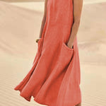 Este vestido longo é a escolha perfeita para quem procura conforto e elegância nos dias mais quentes. Com um corte fluido e design simples, mas sofisticado, ele garante liberdade de movimento e frescor. O detalhe das bolsas laterais não só adiciona um toque prático, mas também um charme extra, permitindo que carregue o essencial com estilo.