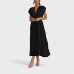 O vestido Paula oferece um look intemporal e elegante. Com um decote em V drapeado, uma cintura alta e uma saia fluida com pregas parapluetadas, cria uma silhueta bonita e harmoniosa. Perfeito para as mulheres que apreciam a elegância subtil e o conforto. Quer seja para um casamento, uma noite descontraída ou um look moderno e casual - o vestido Paula é versátil para muitas ocasiões.