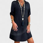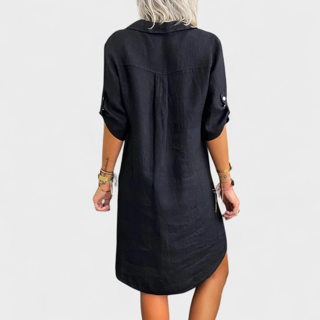 Com corte reto e um caimento leve, esse vestido traz o equilíbrio perfeito entre sofisticação e casualidade. O decote com gola e as mangas dobradas conferem um toque moderno e despojado, ideal para quem gosta de unir conforto e presença marcante em um só look. Versátil e prático, ele se adapta perfeitamente a diferentes acessórios, permitindo criar produções que vão do casual ao chic com facilidade.