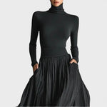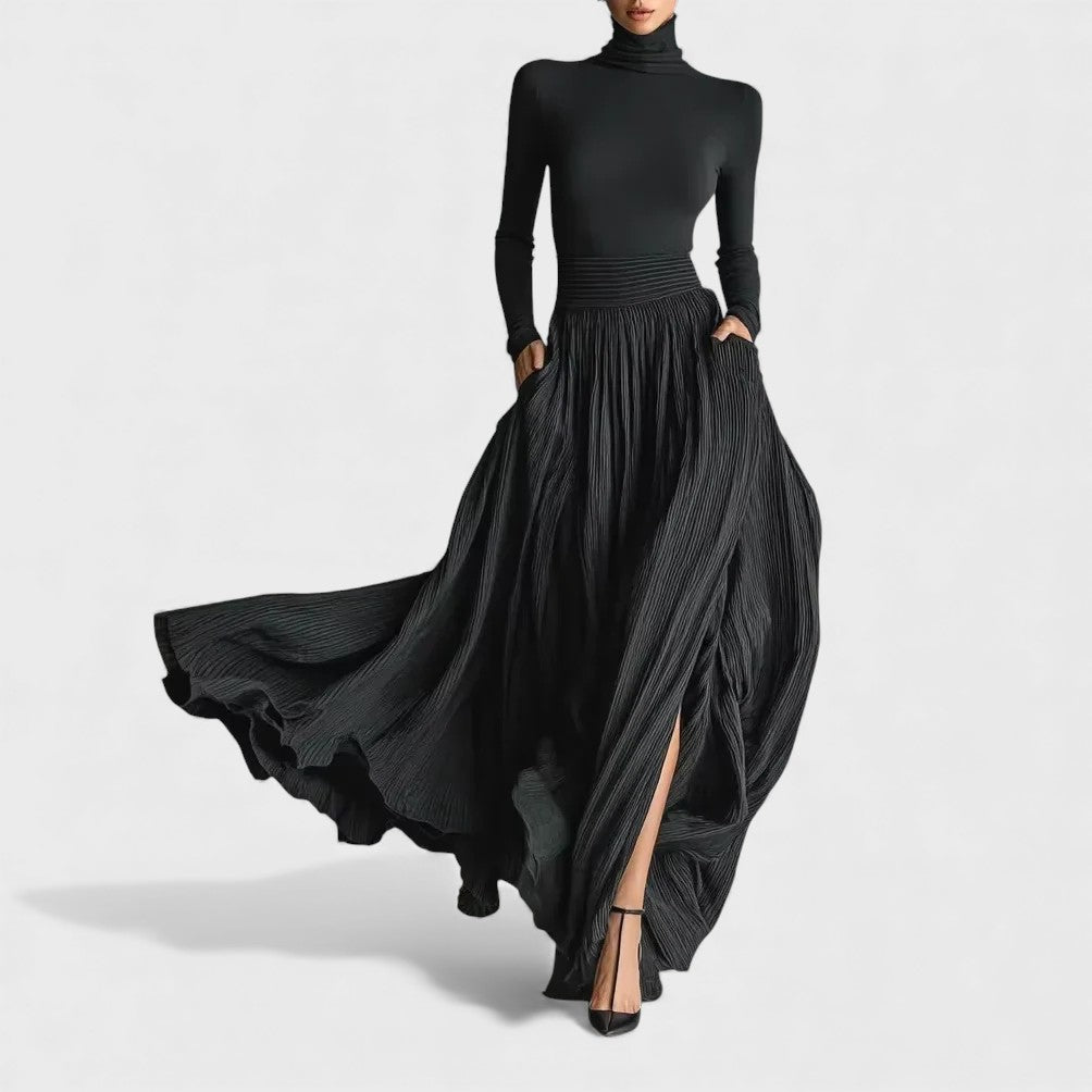 • Design Gola alta, mangas longas justas e saia ampla com pregas e fenda frontal
