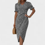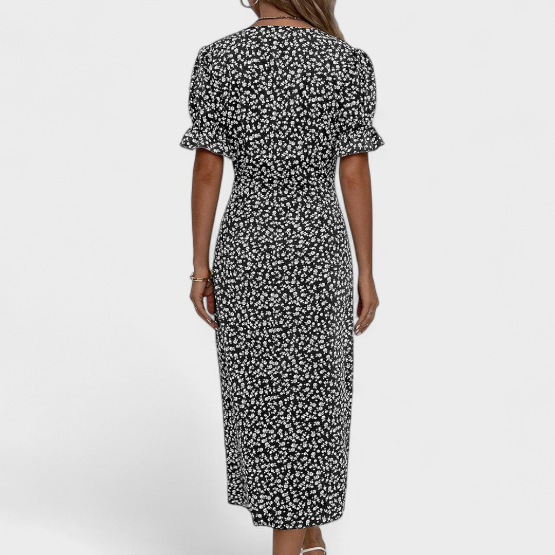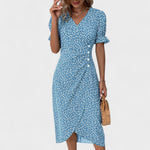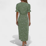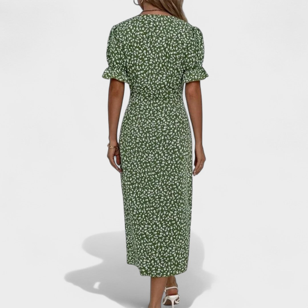 Este encantador vestido verde com padrão floral é a escolha perfeita para quem procura leveza, frescura e um toque de romantismo. Com corte envelope, botões laterais decorativos e mangas com folho, valoriza a silhueta feminina de forma delicada e elegante. Ideal para piqueniques ao pôr-do-sol, passeios de fim-de-semana ou até um brunch entre amigas.