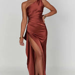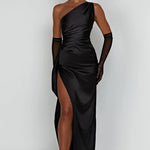 Este cativante vestido de um ombro apresenta um acabamento em cetim elegante com drapeado gracioso ao longo do corpete e da cintura. A silhueta justa flui para uma bainha até ao chão, enquanto uma ousada fenda alta adiciona um toque elegante e audacioso. Perfeito para galas, casamentos ou eventos de gala, este vestido é projetado para chamar a atenção sem esforço.
