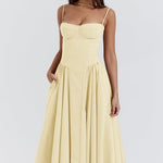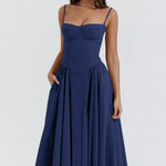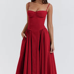 Este elegante vestido midi apresenta um corpete ajustado com detalhes suaves na taça do busto e finas alças de espaguete para uma silhueta feminina. A cintura estruturada flui para uma saia cheia e plissada que se move lindamente a cada passo. Perfeito para brunches, festas no jardim ou casamentos casuais, combina charme vintage com linhas modernas.