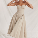- Corpete estilo bustier: O topo contornado oferece leve estrutura e suporte, valorizando o decote e adicionando um toque ajustado à silhueta superior.