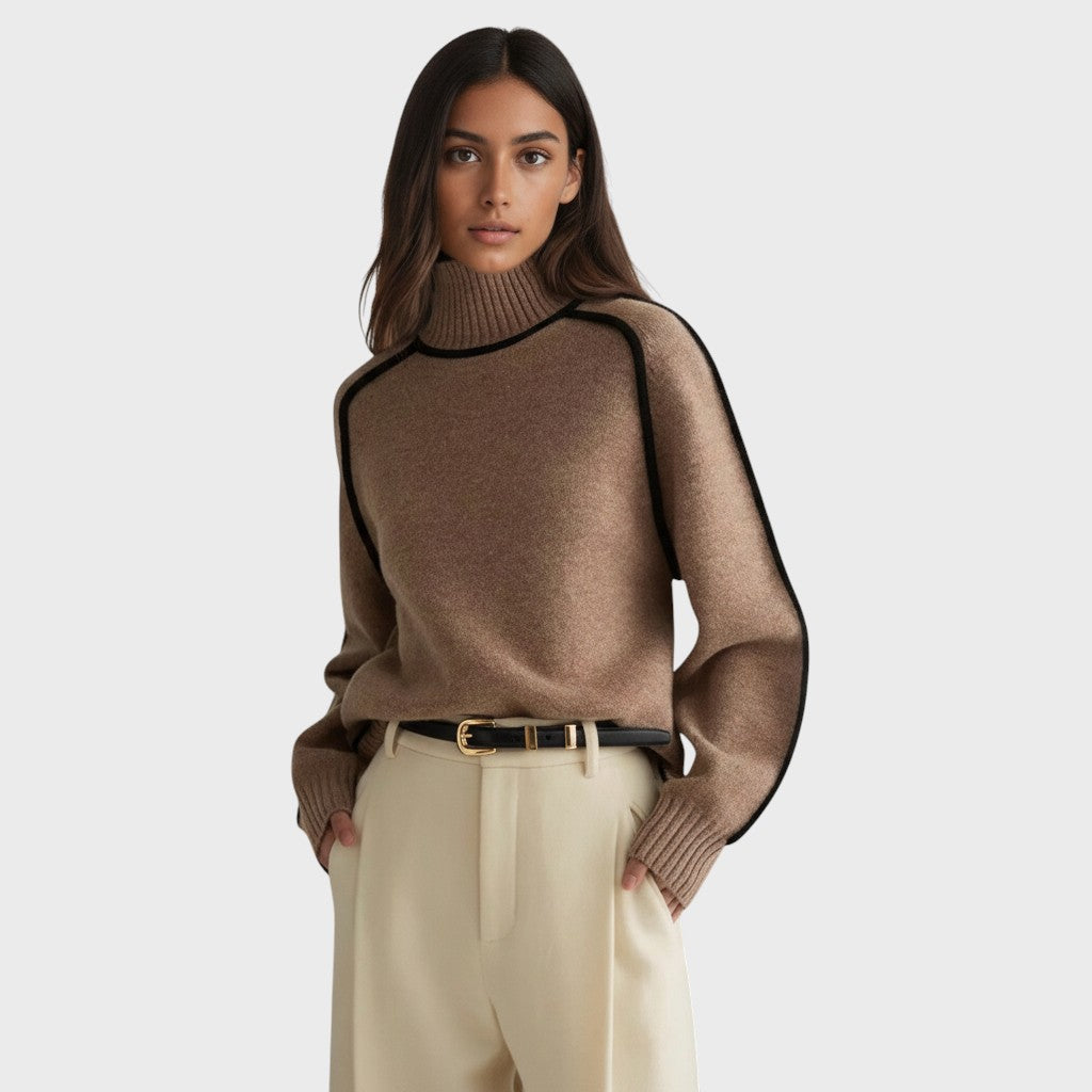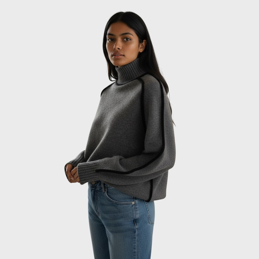 Esta camisola combina simplicidade e detalhe, com bordas contrastantes e um design de gola alta descontraído. A sua silhueta ampla torna-o perfeito para usar por cima de outras peças, proporcionando um visual limpo e sofisticado.