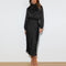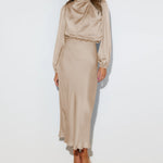 Este vestido maxi apresenta um elegante decote alto com drapeado suave e mangas longas em forma de bispo que se ajustam ao pulso. O corpete flui para uma cintura levemente ajustada, criando uma silhueta lisonjeira que continua numa saia suave que toca o chão. O acabamento em cetim adiciona um toque de brilho refinado, perfeito para saídas à noite ou ocasiões formais.