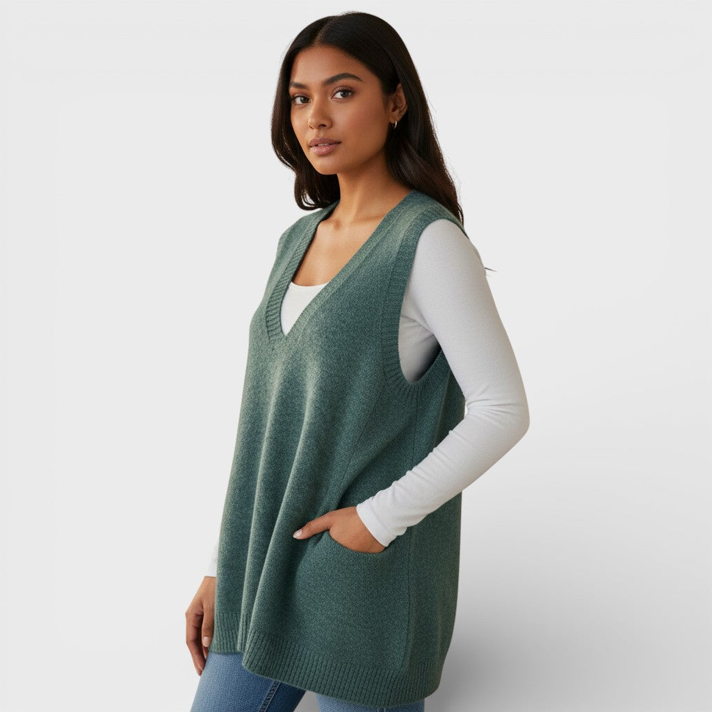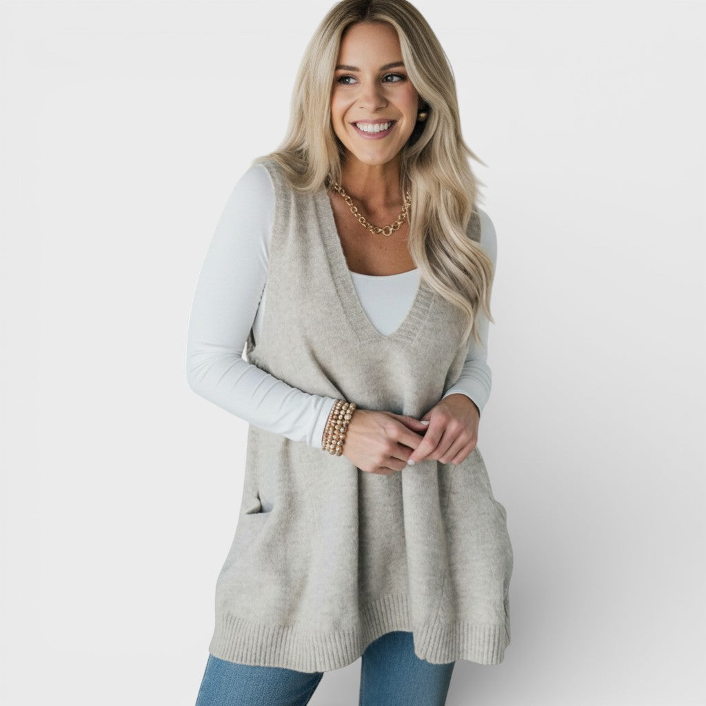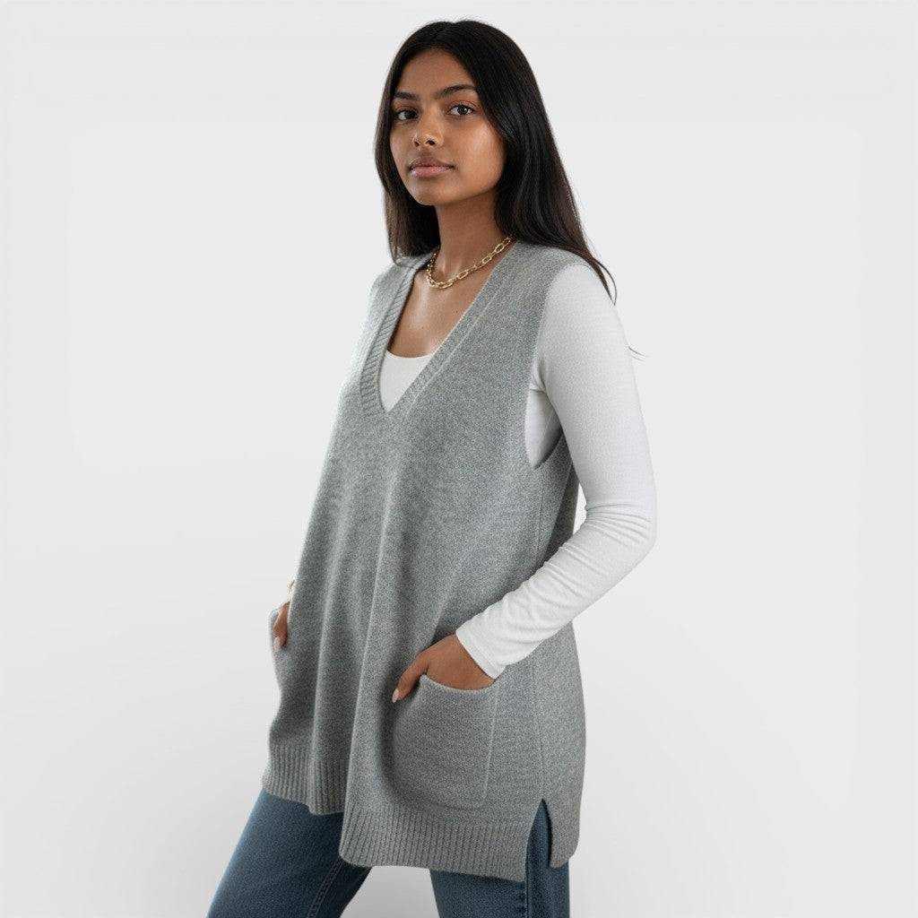 Elegante e quente, este colete é adorado pelos nossos clientes! Este colete fluido e felpudo é perfeito para sobreposição, com seu comprimento longo e corte em A que cria uma silhueta lisonjeira. O material tipo suéter leve oferece calor sem pesar, enquanto a cor mesclada e os detalhes em ribana acrescentam um toque de estilo.